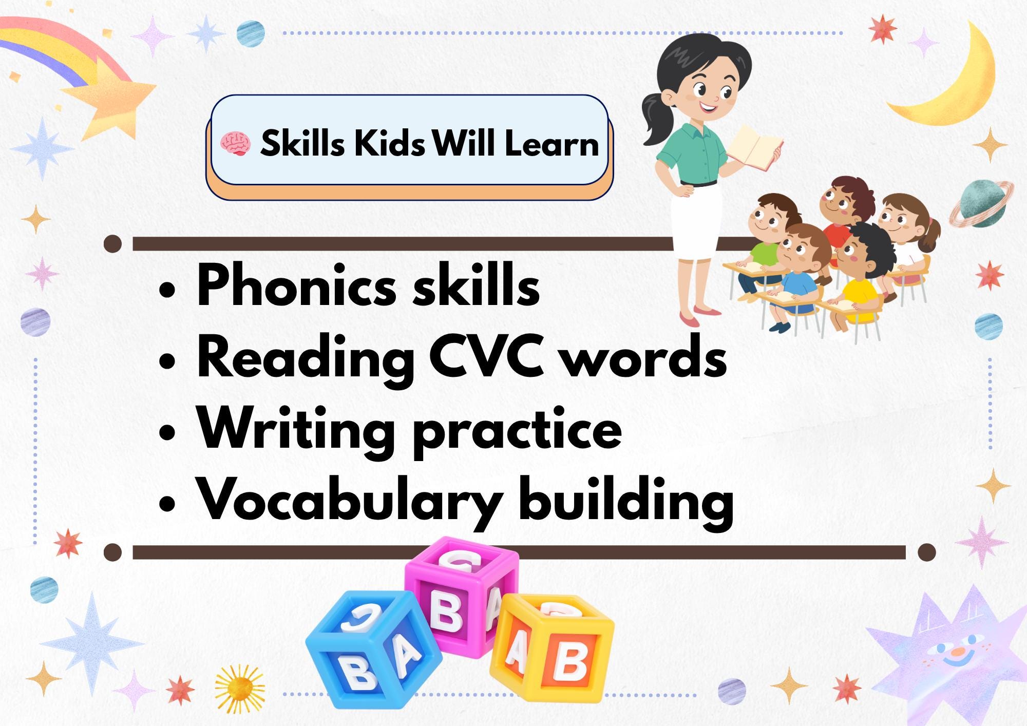 🎯 Skills Developed: • Phonics awareness • Reading CVC words • Writing and tracing • Vocabulary building